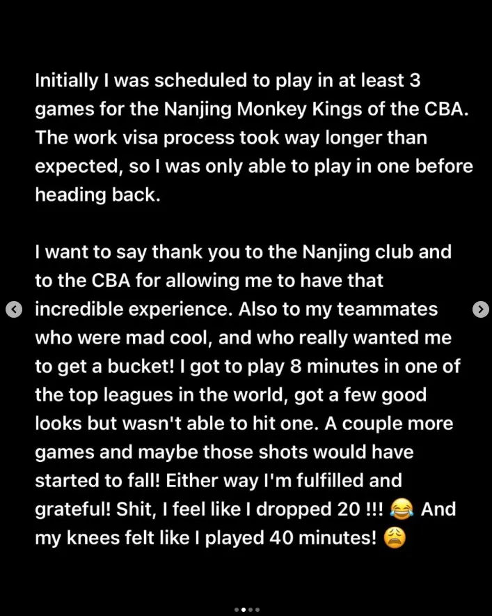 起初,我被安排参加至少三场由中国职业篮球联赛(CBA)南京队举办的比赛。然而,工作签证的办理过程比预期要长得多,因此在我启程回国前仅能参加其中一场比赛。我想向南京俱乐部以及CBA表达我的谢意,感谢它们让我得以拥有这段非凡的经历。同时也要感谢我的队友们,他们表现得非常酷,并且真心希望我能投进一个球!我得以在世界顶级联赛之一的比赛中上场8分钟,虽然有几次不错的出手机会,但未能命中。如果再打几场比赛,或许那些投篮就能逐渐变得手到擒来了!不管怎样,我已心满意足且心怀感激!天哪,我感觉好像得分达到了20分!!!而我的膝盖却感觉像是打了40分钟球一样!除此之外,最大的收获是我和我的家人首次体验了中国。这里的人们很友善,城市干净美丽。是一个非常宁静的地方。高铁简直太棒了。非常便捷。我能在火车上大概一小时内从南京到达上海。从地理距离上来说,这就像是一小时内从华盛顿特区到达纽约一样。我还未曾意识到中国竟有如此多的人对我的音乐情有独钟!感谢每一位到场并带来专辑供我签名的人。我被深深震撼了。